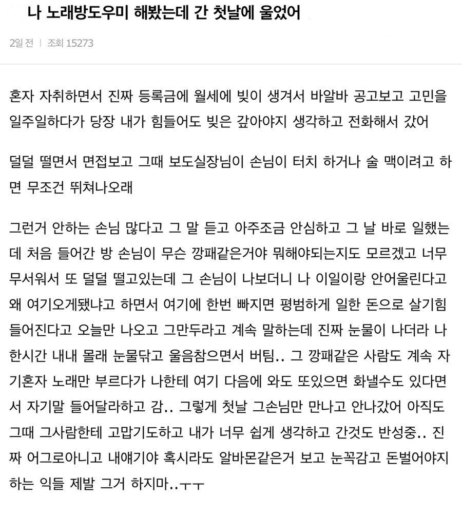 노래방 도우미 첫날만 나가고 그만둔 여성의 썰 풀이