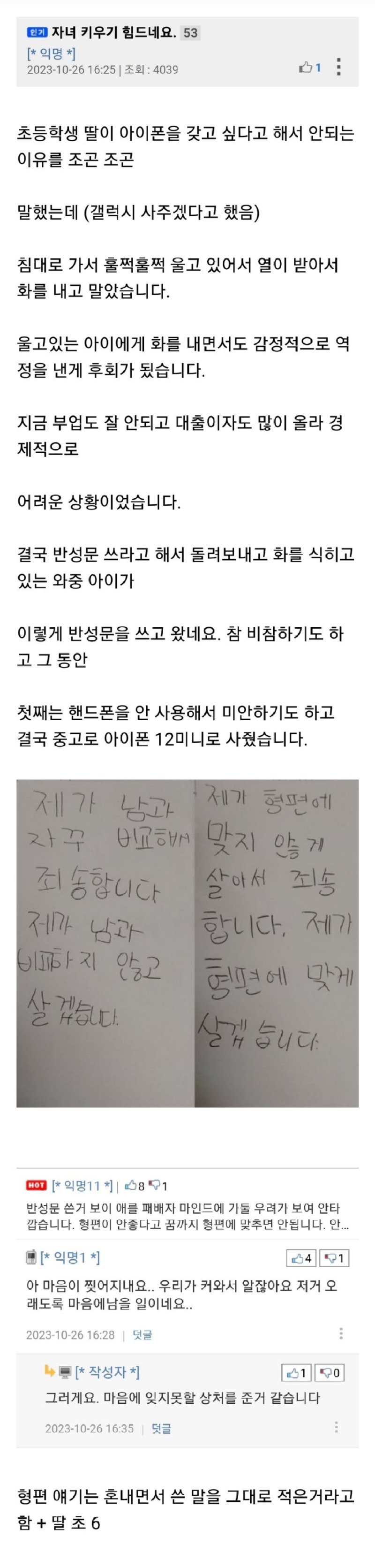 아이폰 사달라했다가 혼난 딸이 쓴 반성문