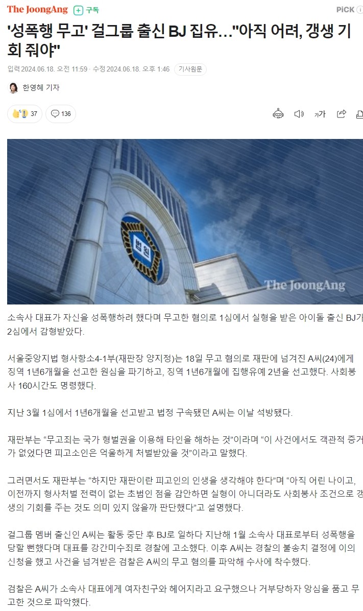 '성폭행 무고' 걸그룹 출신 BJ 집유 "아직 어려, 갱생 기회"