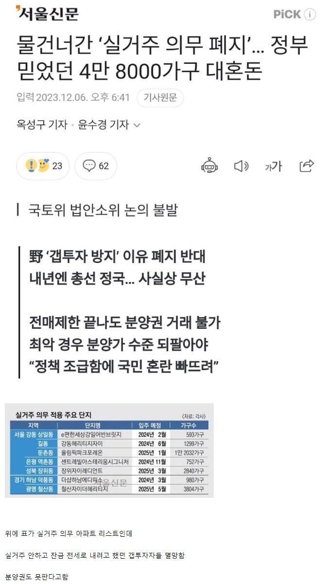 신규 분양 아파트 갭투자자들 멸망 ㄷㄷ