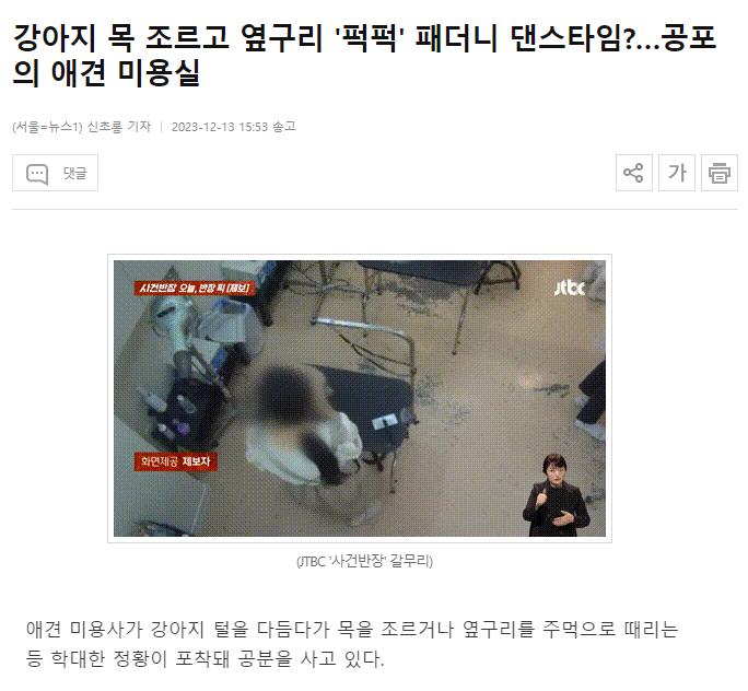 출처 https://www.news1.kr/articles/5260395 미용사는 "강아지가 심하게 난리를 쳐서 훈육하는 과정이었다"라고 해명했다. 이후 A씨는 CCTV를 요청했고, 그제서야 미용사는 강아지 폭행 사실을 인정하고 사과했다. 경기도 고양시에 위치한 애견 미용실이라고 함 ㄷㄷ