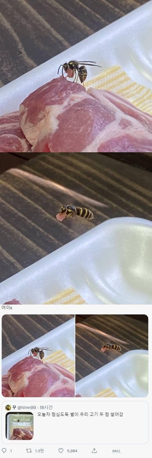 펌) 벌이 날아와서 고기 썰어서 훔쳐 도망감.jpg