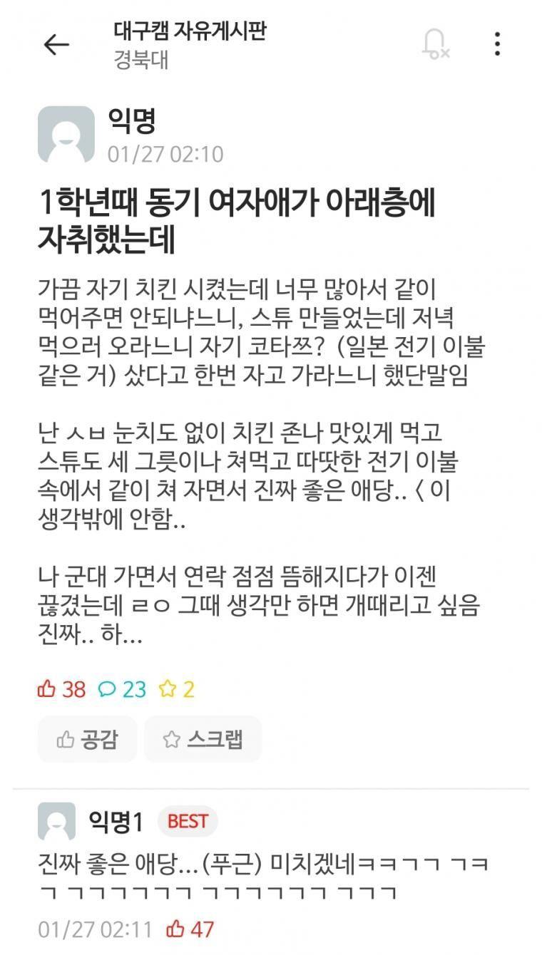 1학년때 동기 여자애가 아랫층에 자취했는데