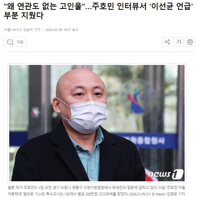 출처 https://www.news1.kr/articles/?5314070 웹툰 작가 주호민씨가 언론 인터뷰에서 故 이선균을 언급했던 부분이 삭제됐다.5일 경향신문은 전날 보도한 주씨의 인터뷰 기사에서 "주씨는 고 이선균씨가 사망했다는 사실을 듣고 '그분이 저랑 똑같은 말을 남겼다고 하더라. 많은 감정이 올라왔다'면서 '개인적으로 알지 못하는 분이지만 추도하는 기도도 혼자 했었다'고 말했다"는 부분을 삭제했다. 이는 해당 부분을 두고 일각에서 "고인을 들먹이는 건 유족에게 상처다", "왜 연관도 없는 사람을 끌고 오냐", "신중하지 못한 발언이다" 등 부정적인 여론이 일자 주씨 측이 이를 의식해 조치를 취한 것으로 보인다.