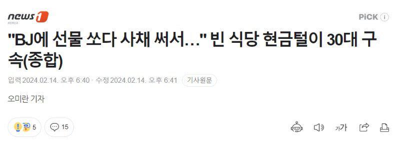 아무도 없는 식당에 잇따라 침입해 수백만원을 훔친 30대 남성이 경찰에 붙잡혔다. BJ(인터넷방송 진행자)에게 선물을 보내려다 빚을 져 범행에 나선 것으로 조사됐다. 15일 뉴스1에 따르면 제주동부경찰서는 야간건조물침입절도 혐의로 A씨를 구속했다. 그는 지난 5일부터 10일까지 제주시 소재 식당 18곳에서 총 450만원의 현금을 훔쳐 달아난 혐의를 받는다. 식당 영업이 끝나 사람이 없는 새벽 시간, 잠기지 않은 출입문이나 창문을 통해 가게에 침입한 뒤 카운터 금고를 턴 것으로 드러났다. 지폐뿐만 아니라 동전을 일일이 챙겼다고 한다. 경찰은 설 명절 특별 형사활동을 벌이던 중 신고를 받고 전담수사팀을 꾸려 지난 11일 A씨를 붙잡았다. 그는 경찰 조사에서 "BJ에게 선물을 보내기 위해 사채를 써 이를 갚으려다 범행을 저지르게 됐다"는 취지로 진술했다. https://news.mt.co.kr/mtview.php?no=2024021506364561800&VN
