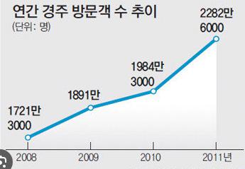 2008-2011년에도 계속 오르고 있었다. 22년에 4천5백만.통계에는 없으나 2012-18년에도 오르고 있었을듯. 22년엔 코로나 극복하고 4천5백만임. 이제 5천만 달성한다 만다 소리가 나오고 있음. 경주 관광은 잘나간다 쳐도 왜 거기 숙박업소는 망해가는걸까?왜냐면 이미 오래 전에 망한 곳이기 때문이다. 저출산시대 + 수학여행 트랜드 + 숙박업소 노후화 때문에우후죽순 세워졌던 양산형 학생 대상 숙박업소가 문을 닫은거. 절대 tip. 주말, 경주 황리단길에 자동차 가지고 가지마라. 지옥이다.