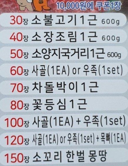 우리동네 정육점 쿠폰임1만원당 한장을 주는데 5년 이상을 여기 다니면서 매해 명절마다 선물세트도 보내고 해서 그 동안 소꼬리 교환(150장)도 한 번 하고 최근에는 200장도 모아놓음그래서 소꼬리(150장)랑 양지(50장) 바꾸러갔더니올해부터 쿠폰이 이걸로 바꼈다는거임쿠폰 200장 소꼬리+양지 한근이 4만원으로 바뀌는 마술..그런게 어디있냐고 따졌더니 마지못해 교환해주겠다고 해서 소꼬리는 며칠 후에 교환해준다고하고양지는 바로 교환받아옴그런데...집에 와서 무게재보니 400g도 안되는 양만 준거임소꼬리는 얼마나 적은 양 줄지 모르겠음5년간 적어도 400만원 이상 쓴 단골이었는데(저 200원 쿠폰도 많이 모아놓음...) 배신감 느껴서 옮겨야겠음