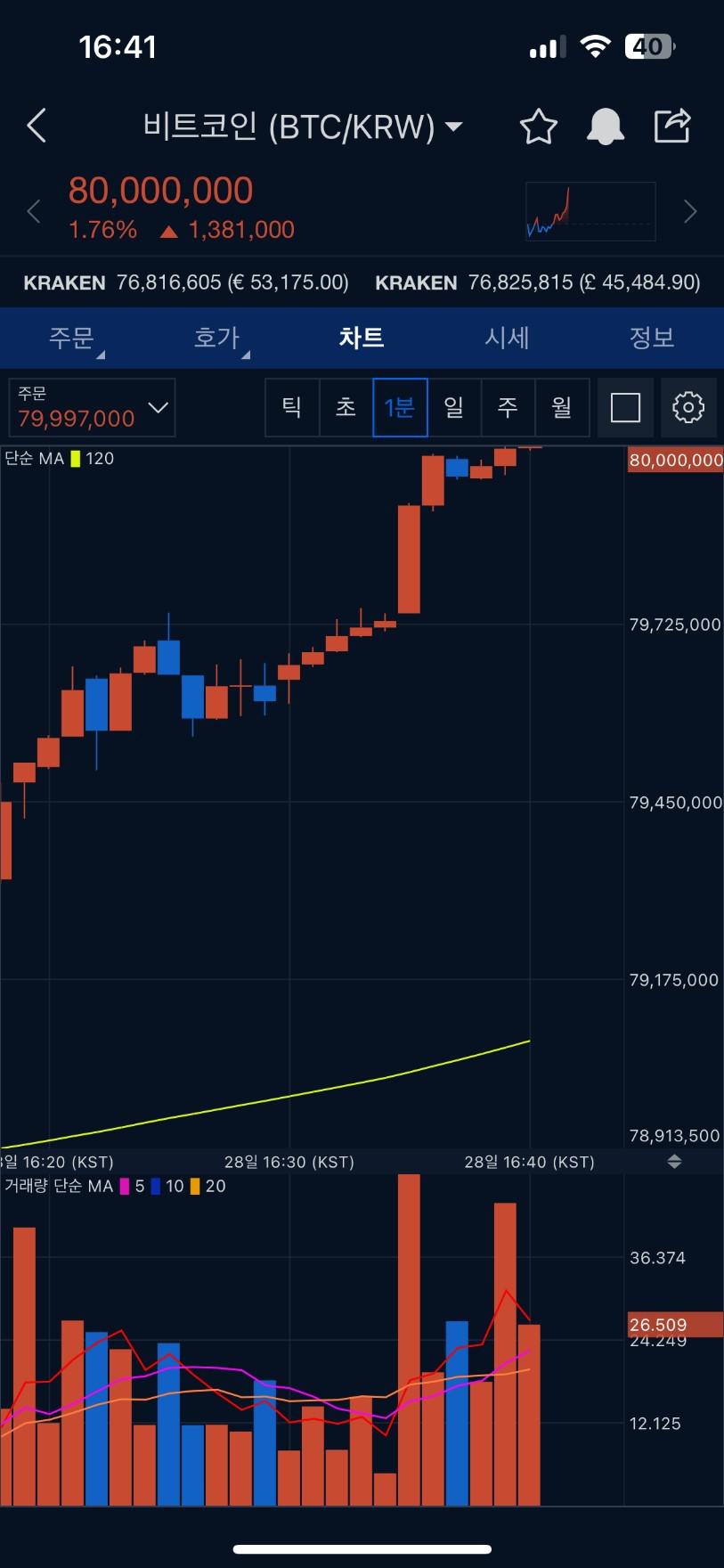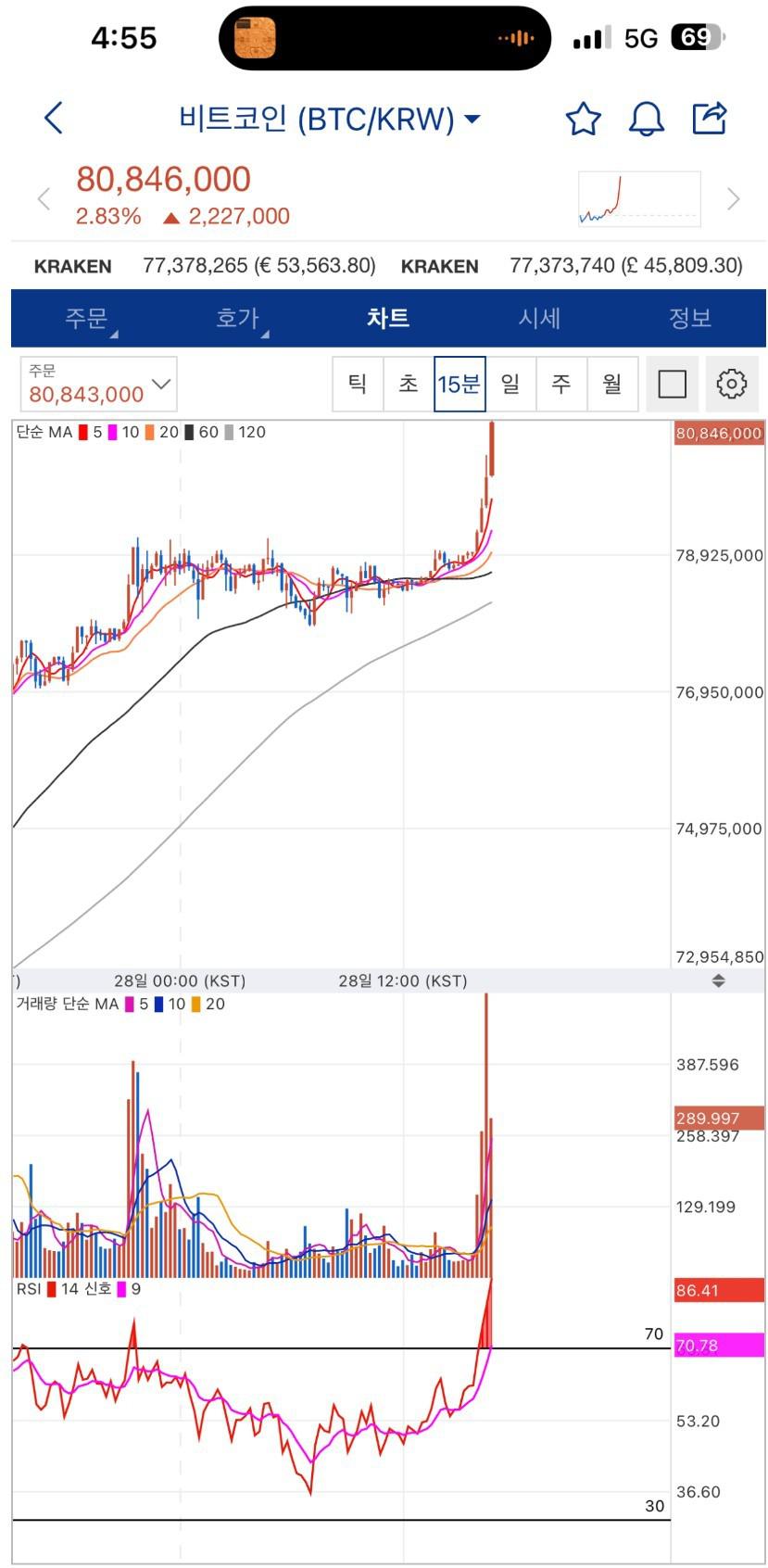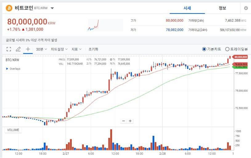 8천 찍었음 ㄷㄷㄷ 최고점 8270만원 얼마 안남음 시가총액 엔비디아 넘음