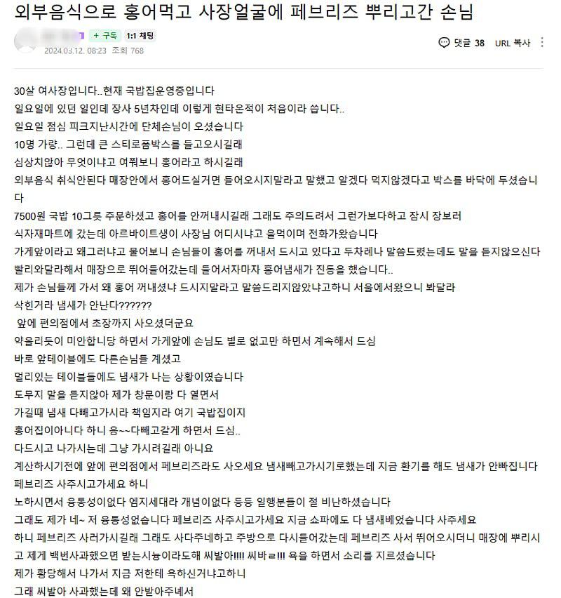 외부음식으로 홍어 먹고 사장 얼굴에 페브리즈 뿌리고 간 손님.jpg