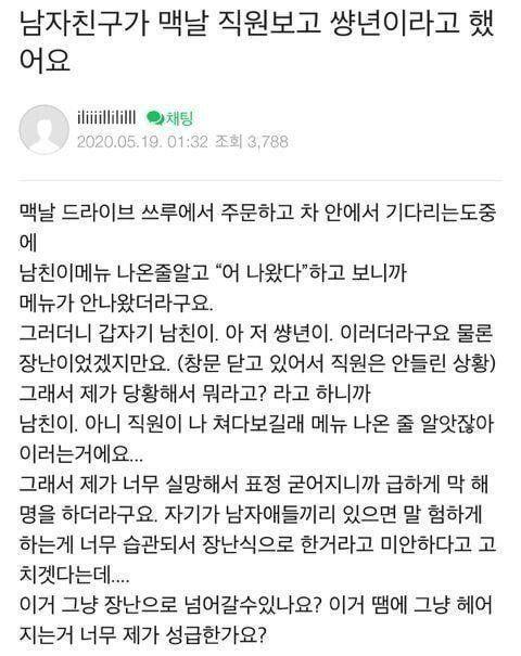 남자친구가 맥날 직원보고 썅년이라고 했어요