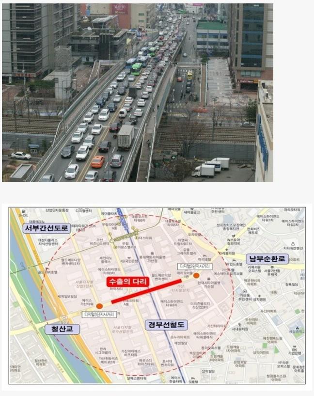 1970년, 경부선을 건너기 위해만들어진 '수출의 다리'출, 퇴근시간여기 다리 건너는데 지옥이죠...이 구로ㅡ금천 구간 만큼은경부선을 지하화 시켜서도로 평면교차로를 많이 만들어교통체증을 줄여야 합니다.