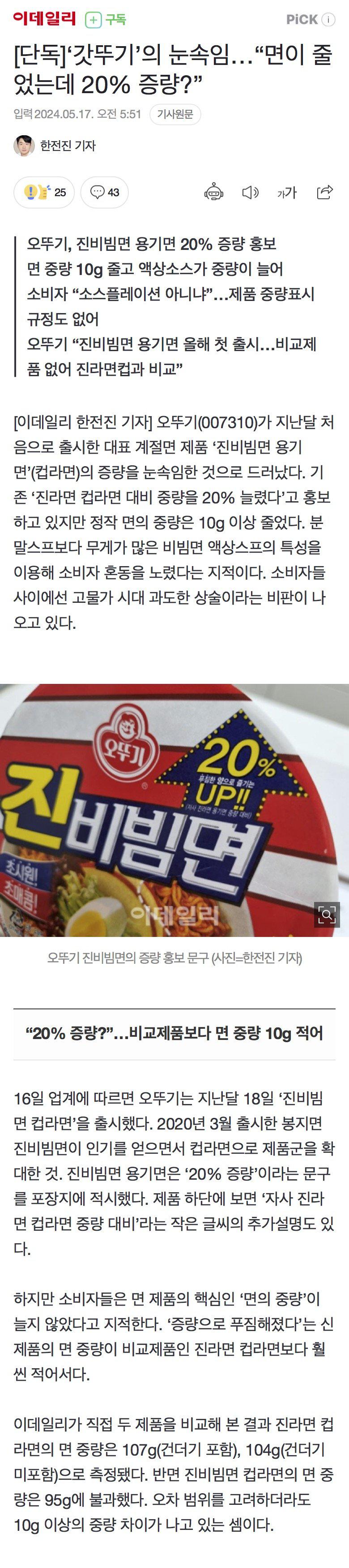 최근 출시된 오뚜기 컵라면이 욕먹는 이유