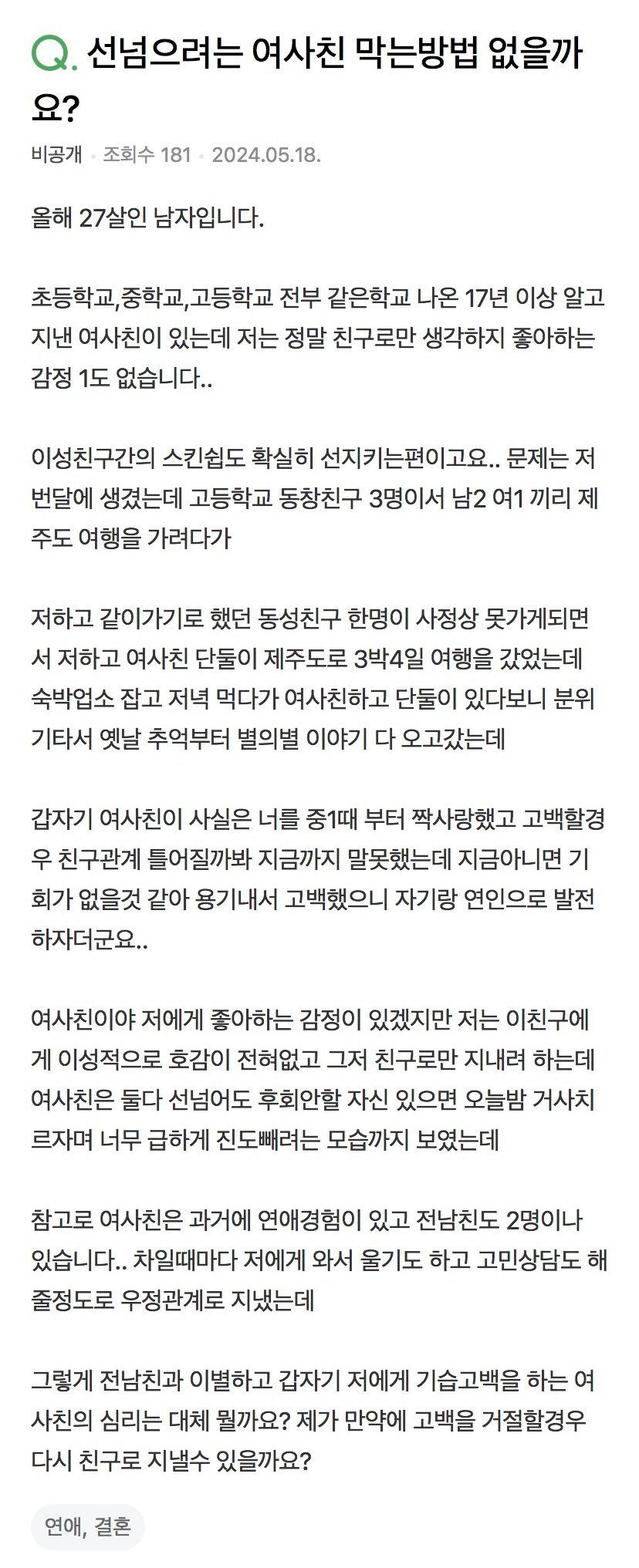 여사친이 잠자리 요구에 기습고백 해서 난감한 남사친