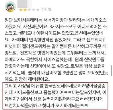 배민에서 한글메뉴를 요구한 손님