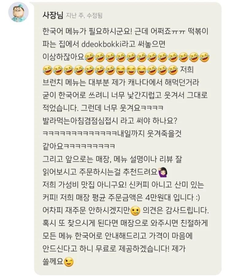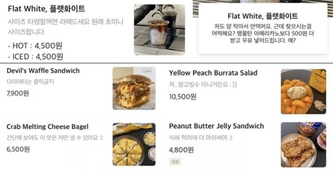사장의 답변 해당카페의 메뉴이름