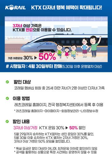 "KTX 다자녀 행복 혜택이 확대됩니다!"50% 할인이 된대서, 아이 셋 마치는 시간대에 맞춰서 예약해봄다자녀 할인 버튼 누르고 5일 오후3시 이후 성인 1, 아동 3으로 검색~스캔 중...음??벌써 자리가 다 나갔나 싶어서 일반석으로 성인 1, 아동 3으로 알아봄스캔 중...일반석으로 검색하면 좌석 매우 널널함.결론. * 공석을 활용한 상품으로 특정 시간대에는 운영하지 않을 수 있으나,운영하지 않는 특정시간이 매우 많음. 다자녀 행복 혜택이 확대되지만, 니가 누릴 혜택은 없다. 엔딩