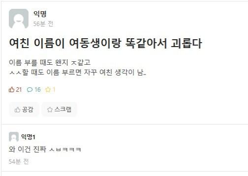 여친이랑 여동생이랑 이름이 똑같을 때 단점