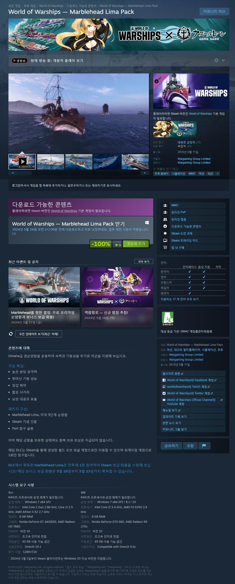 [기타] 스팀 World of Warships — Marblehead Lima Pack 무료