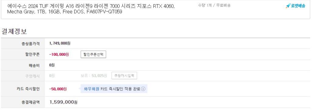 [쿠팡] ★최종가 159만원★ ASUS TUF Gaming A16 FA607PV-QT059 라이…