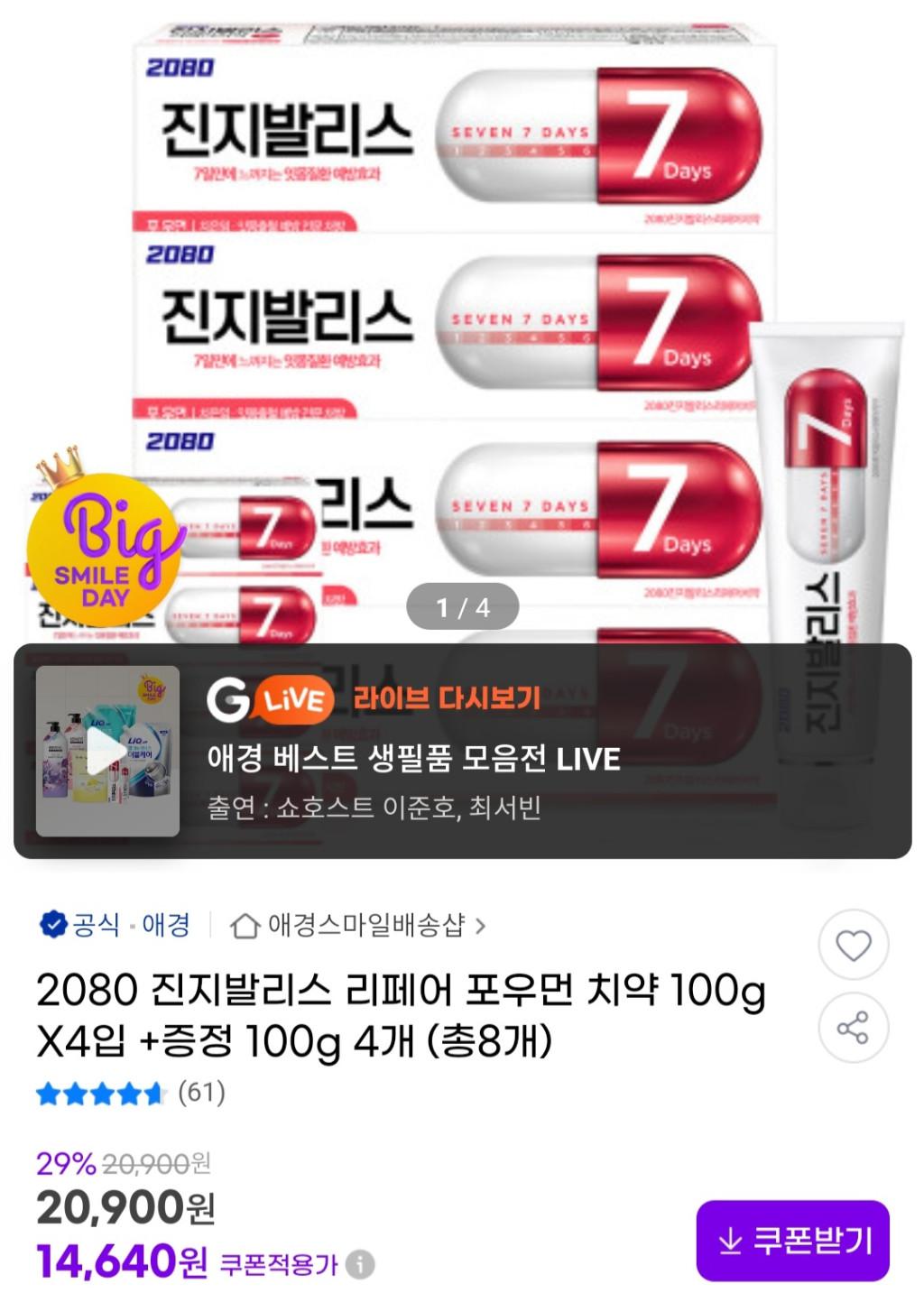 [G마켓] 2080 진지발리스 리페어 포우먼 치약 100g x 8입