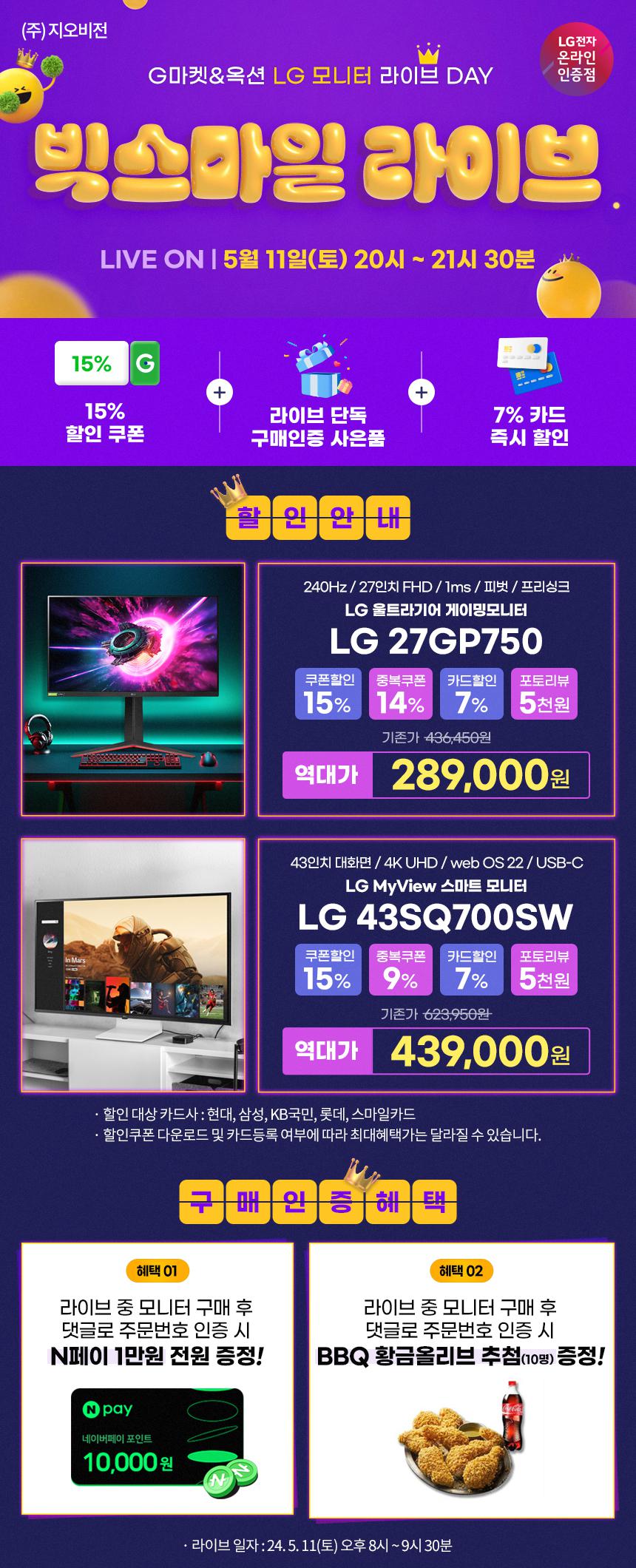 [G마켓] 빅스마일 앵콜 G-Live LG 43SQ700SW / 27GP750 역대가 31%할인 …