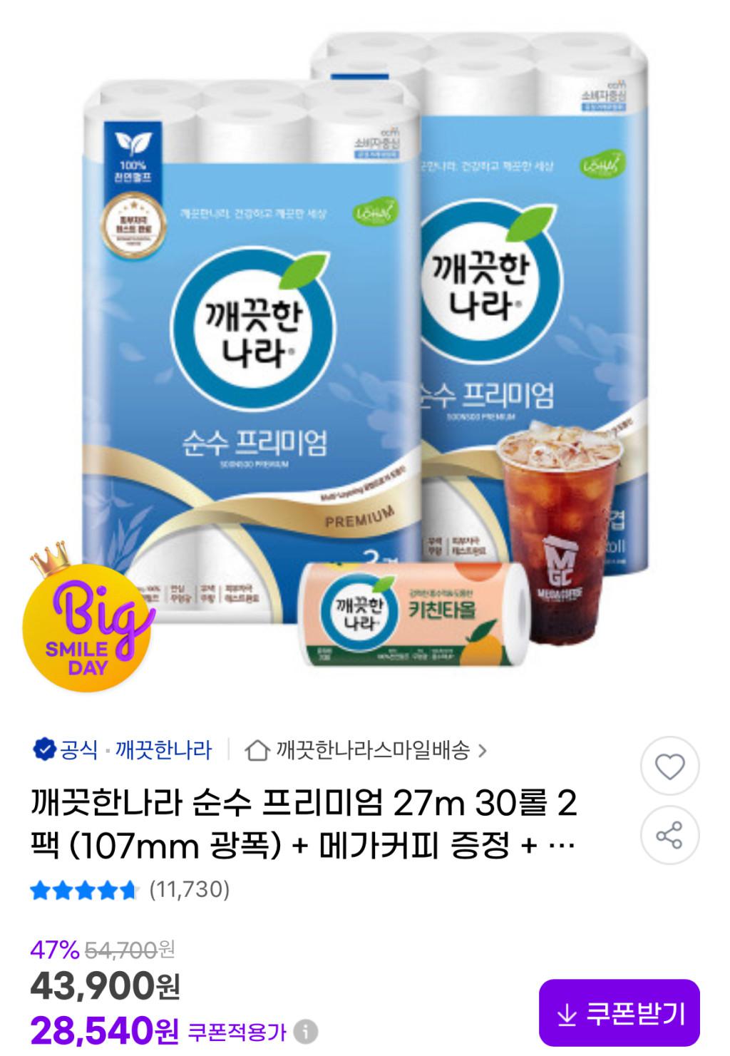 [G마켓] 깨끗한나라 순수 프리미엄 27m 30롤 2팩 (107mm 광폭) + 메가커피 증정