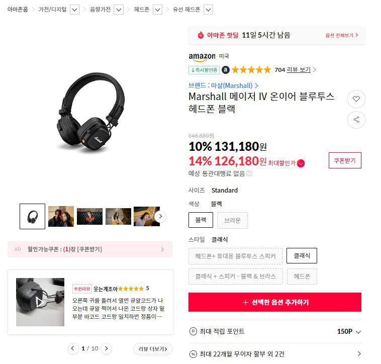 [11마존] 마샬 메이저 4 온이어 블루투스 헤드폰 (131,080원/무료)