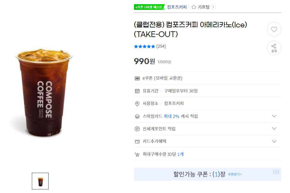 [G마켓] (클럽전용) 컴포즈커피 아메리카노(Ice)(TAKE-OUT)