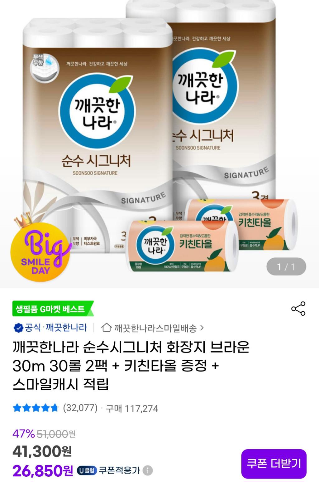 [G마켓] 깨끗한나라 순수시그니처 화장지 브라운 30m 30롤 2팩 + 사은품 + 스마일캐시