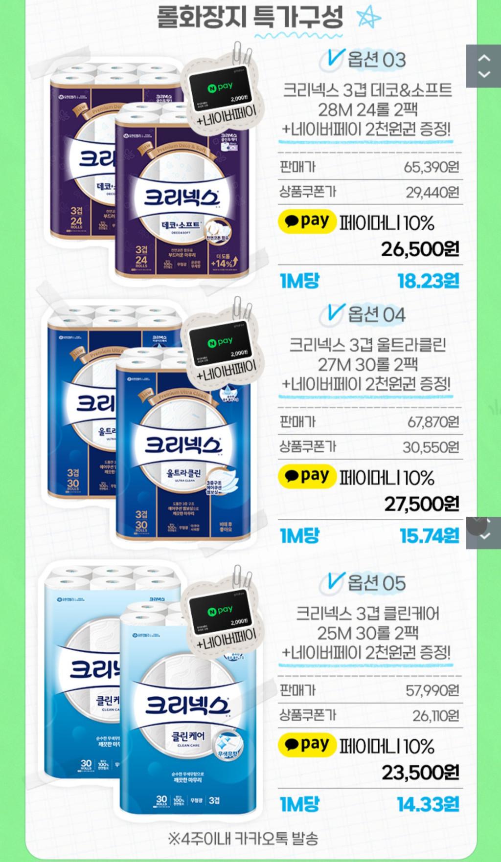 [티몬] 크리넥스 3겹 데코 앤 소프트 28m24롤 2팩+네이버페이2천증정/ 카카오페이머니(무배…