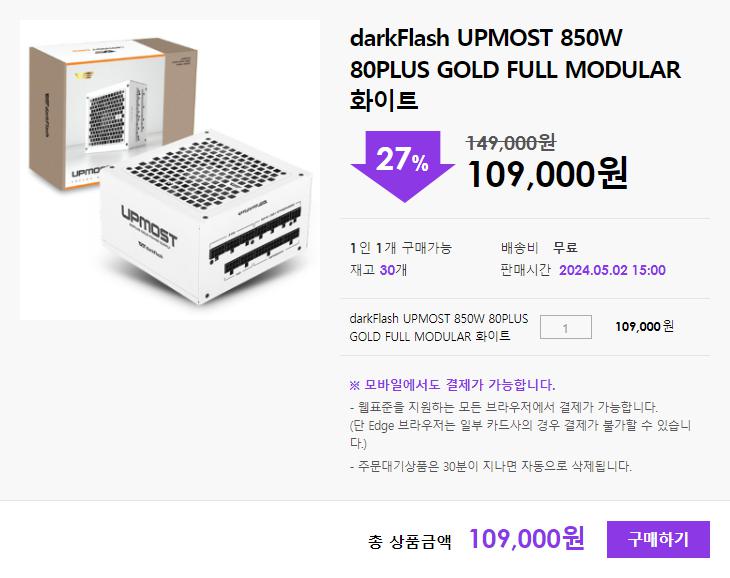 [다나와] 다크플래쉬 UPMOST 850W 80PLUS GOLD FULL MODULAR (화이트)