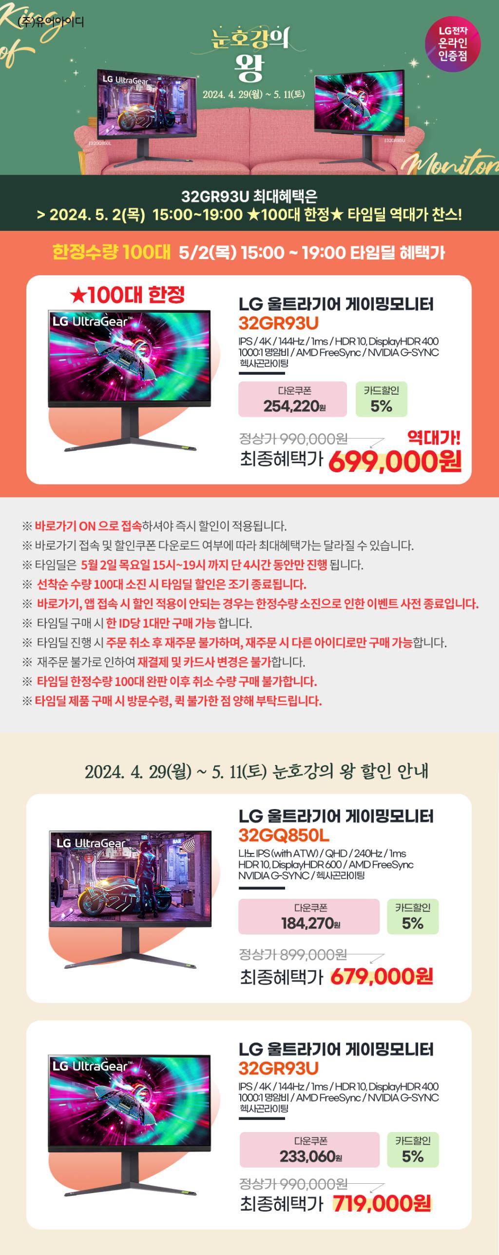 [네이버] LG 24GN60K(15.9만) 외 울트라기어 게이밍, 스마트TV 모니터 가정의달 라이브…