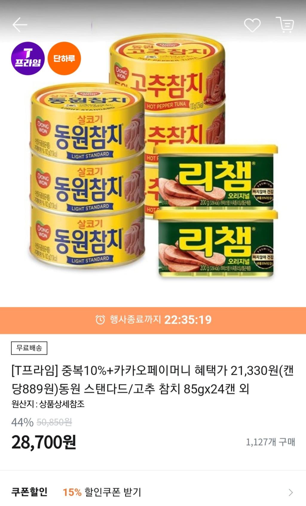 [티몬] 동원 라이트스탠다드 참치 86g x 24캔