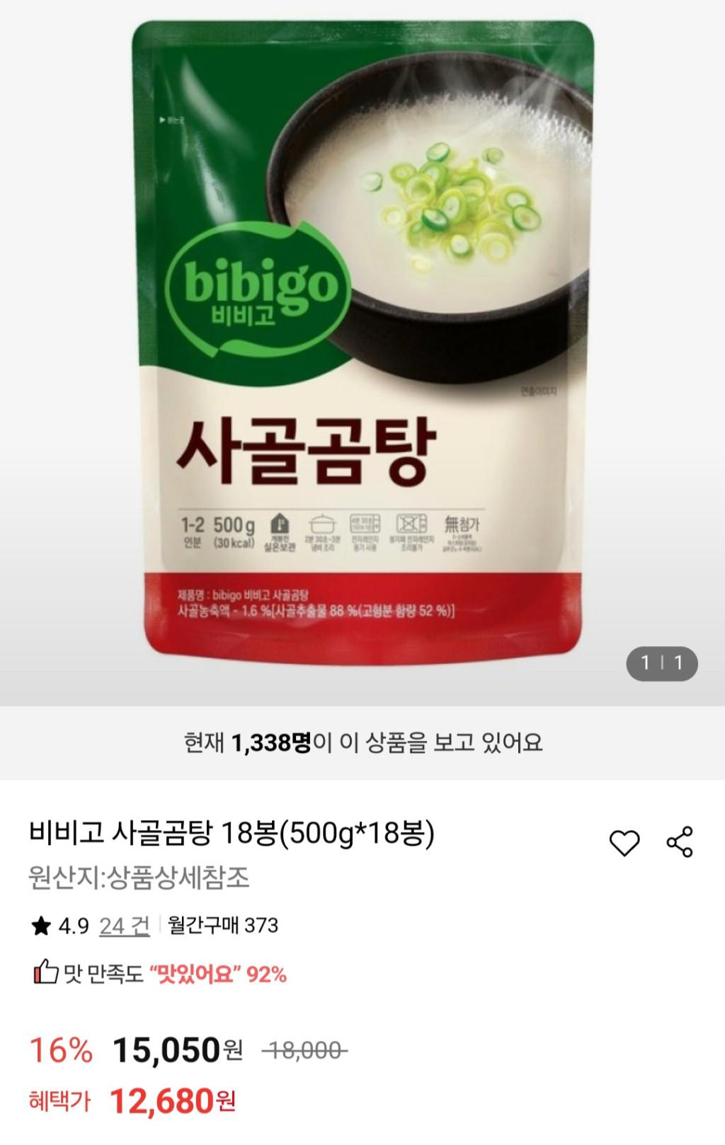[롯데온] 비비고 사골곰탕 18봉(500g*18봉)