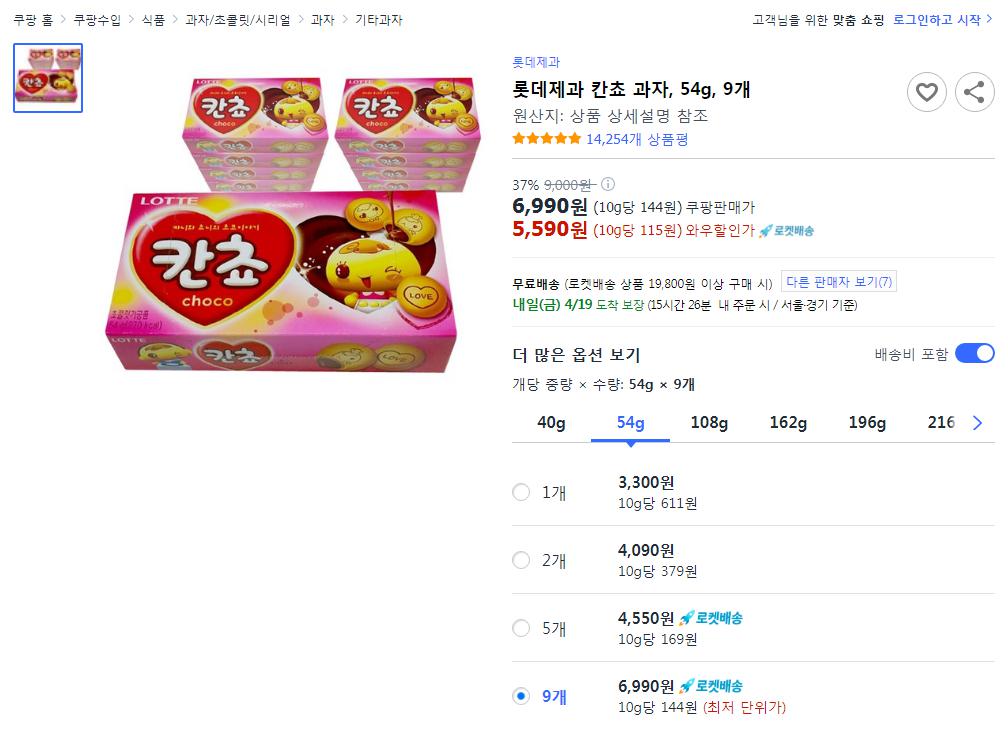 [쿠팡] 롯데제과 칸쵸 과자, 54g, 9개