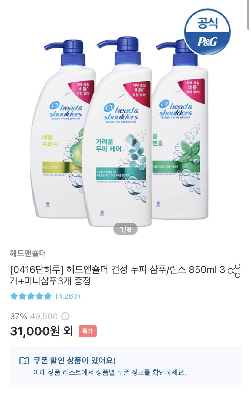 [오늘의집] 헤드앤숄더 샴푸/린스 850ml 3개+미니샴푸3개