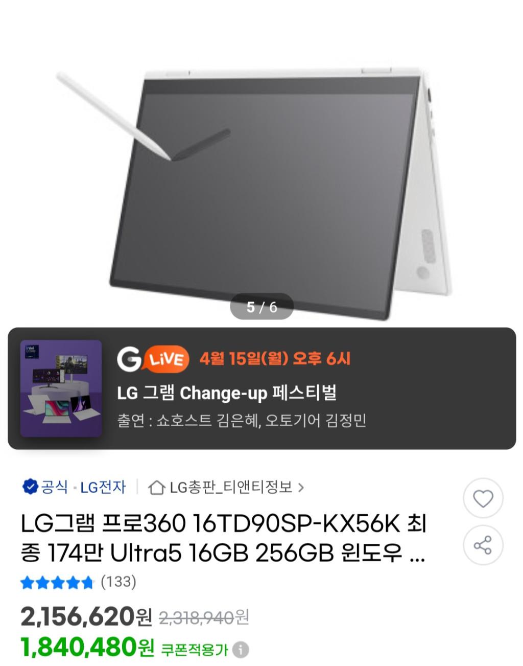 [G마켓] 엘지 그램 프로360 Ultra5 16GB 256GB