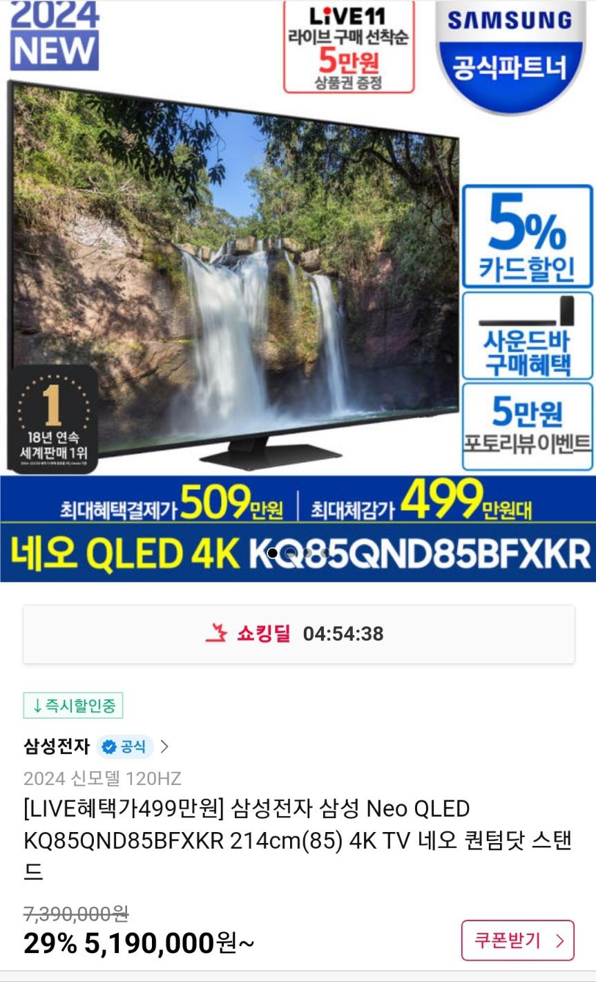 [11번가] 삼성 Neo QLED KQ85QND85BFXKR 85인치