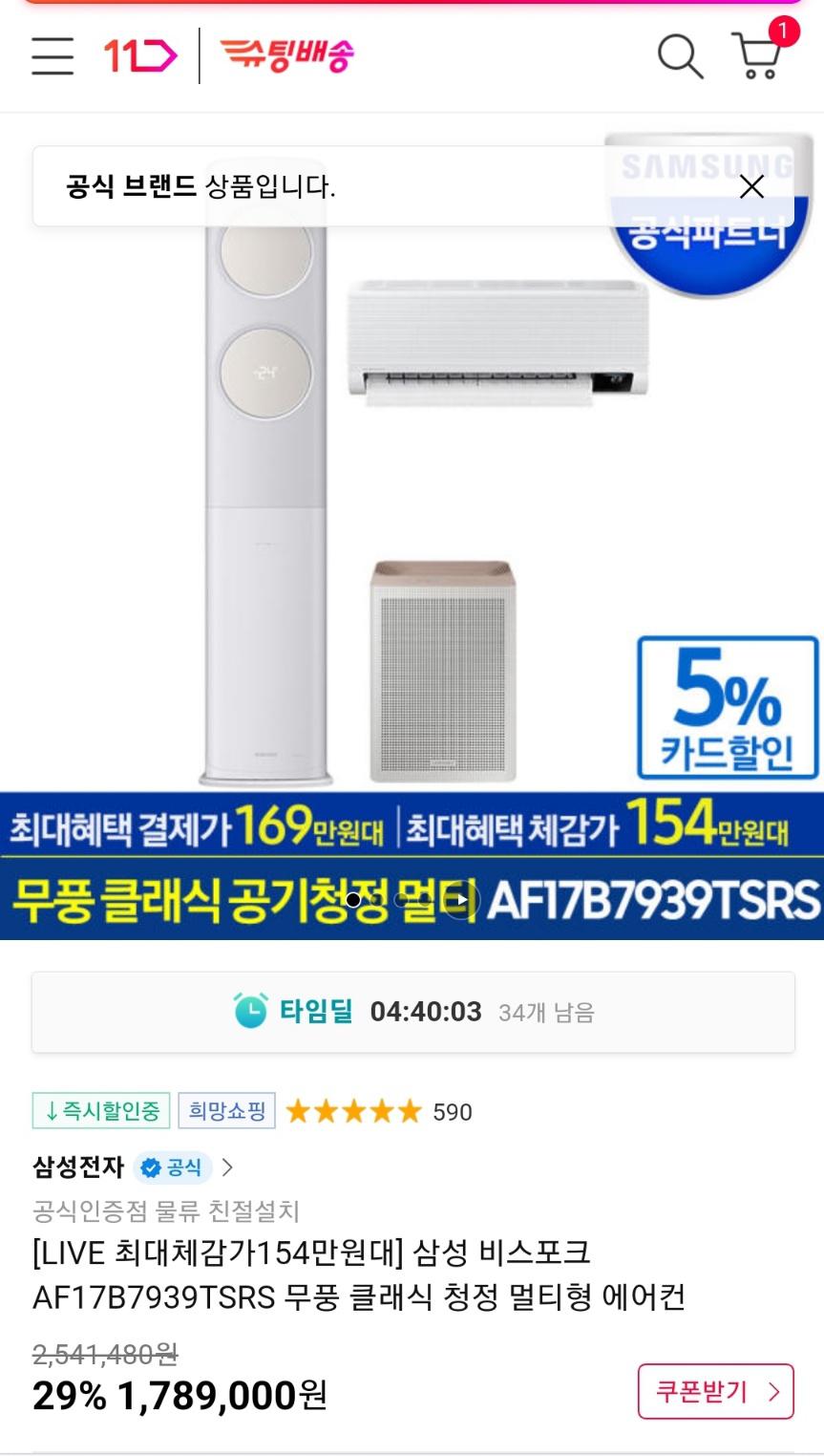 [11번가] 삼성비스포크 AF17B7939TSRS 무풍 클래식 청정 멀티형 에어컨
