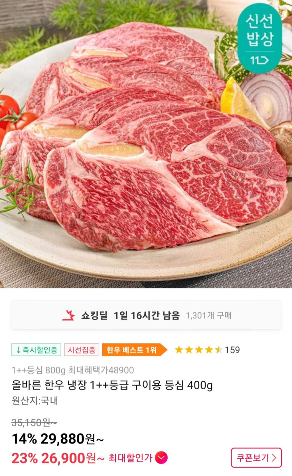 [11번가] 냉장 투쁠 한우 등심 400g 구이용
