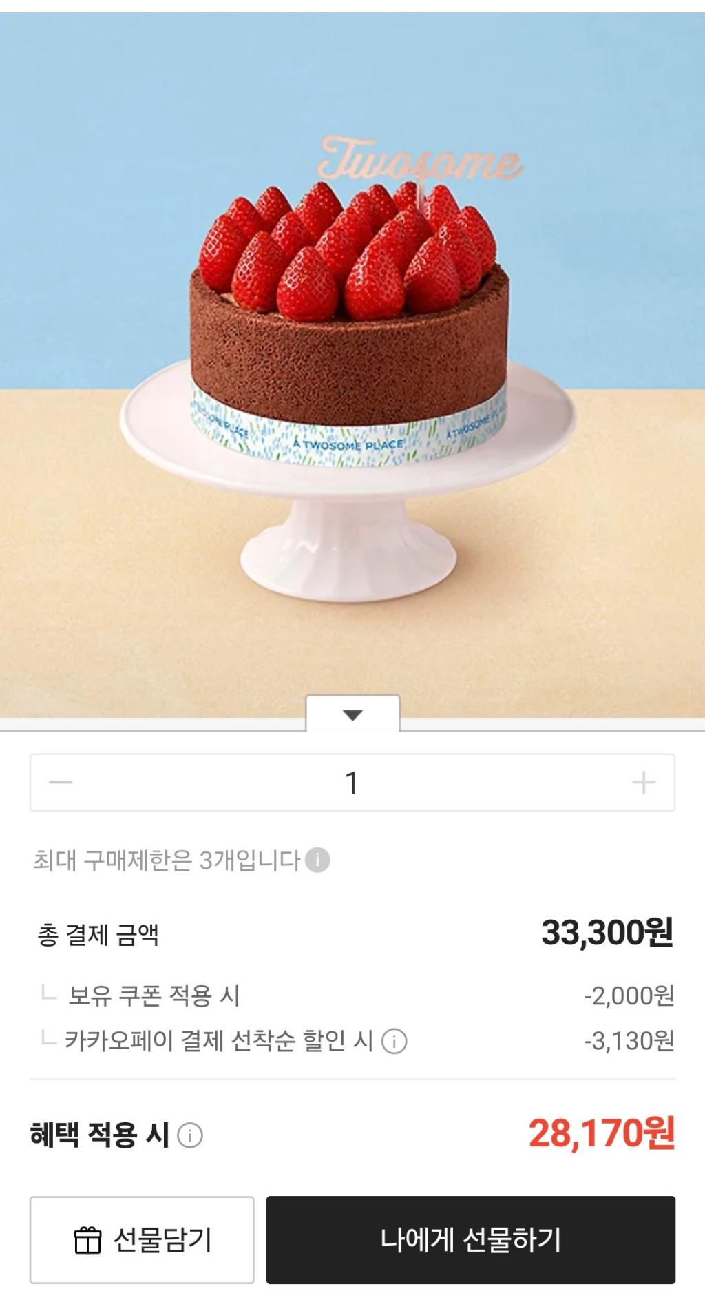 [카카오톡딜] 투썸플레이스 스트로베리 초콜릿 생크림, 더블 스트로베리 쉬폰 케이크