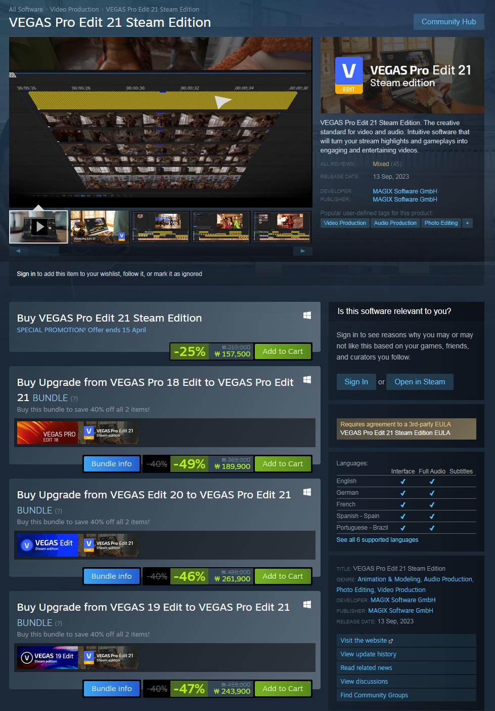 [기타] 스팀 VEGAS Pro Edit 21 Steam Edition 할인 영상편집기