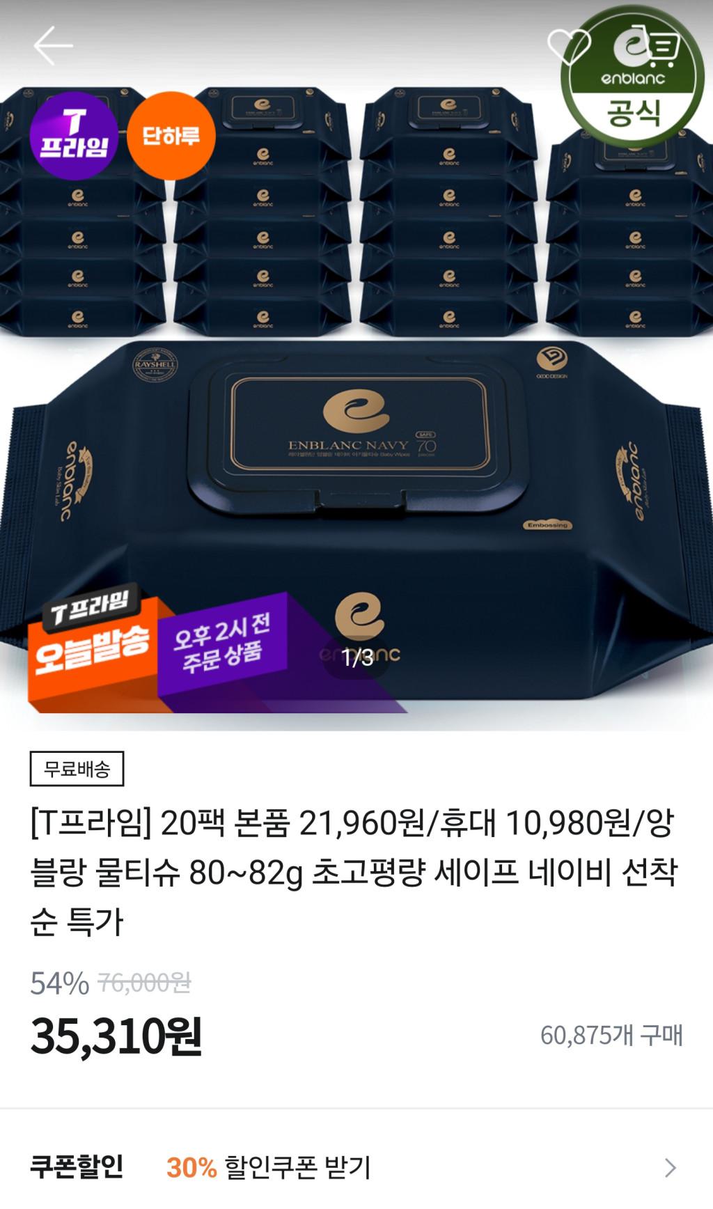 [티몬] 앙블랑 세이프 네이비 물티슈 70매 20팩 카카오페이 (무배)