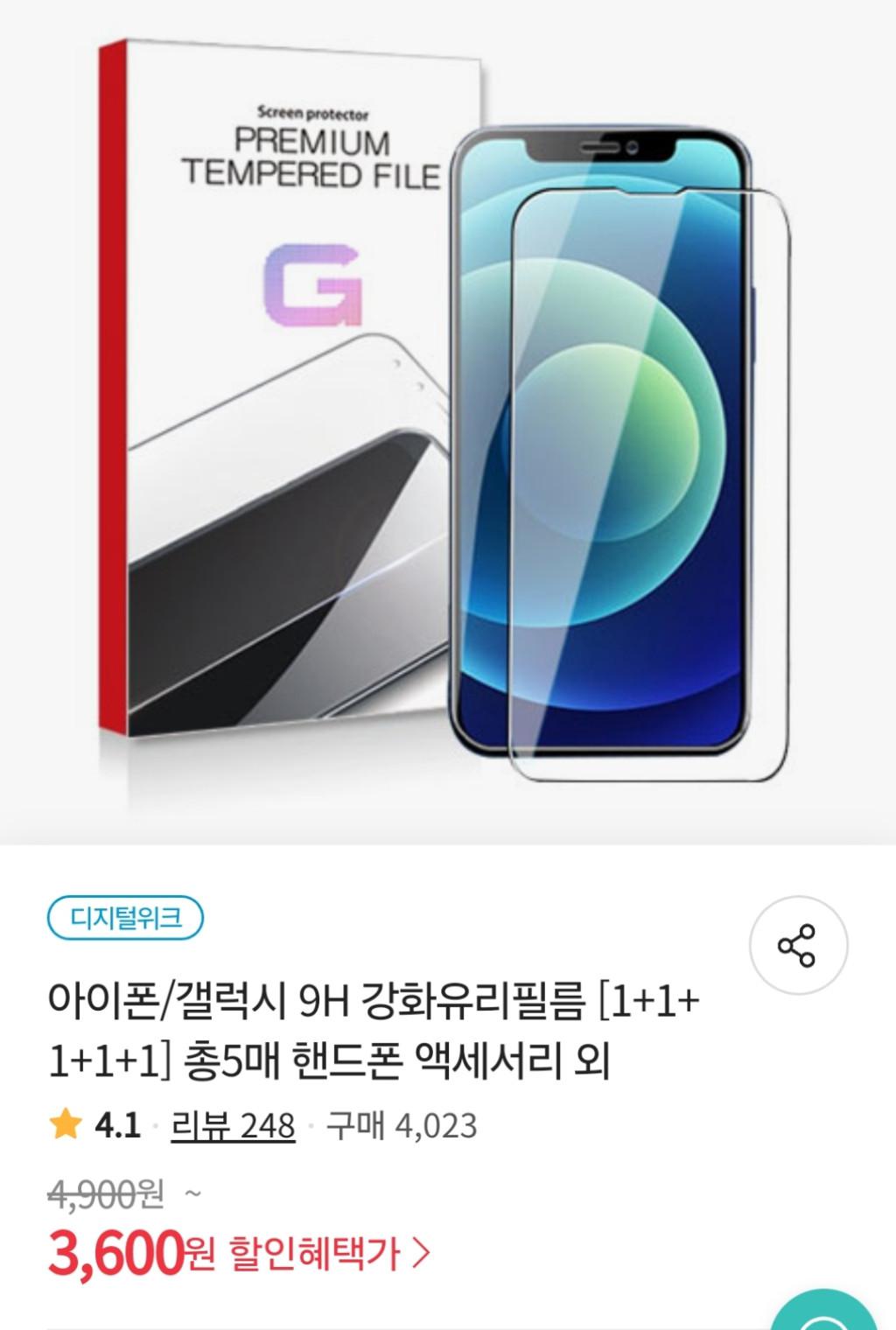 [위메프] 9H 강화유리필름 총 5매 (무배)