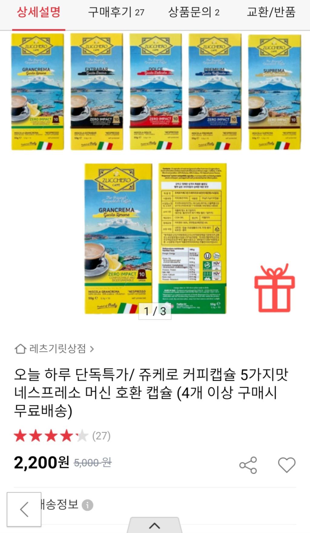 [옥션] 쥬케로 카페 네스프레소 호환 커피캡슐 130개 (22,000원/무료)