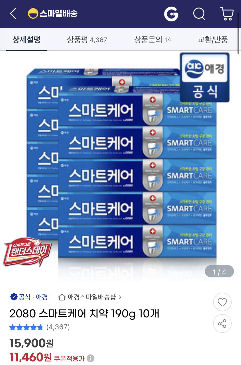 [G마켓] 2080 스마트케어 치약 190g 10개