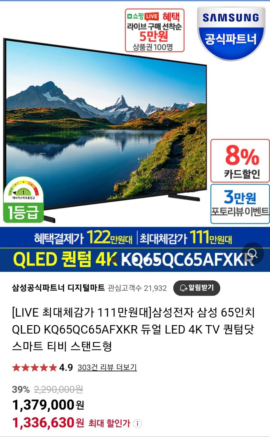 [네이버] 삼성 65인치 QLED TV KQ65QC65AFXKR