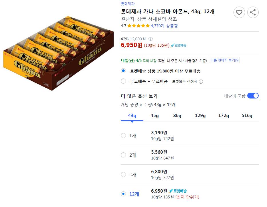 [쿠팡] 롯데제과 가나 초코바 아몬드, 43g, 12개 와우 무료 배송
