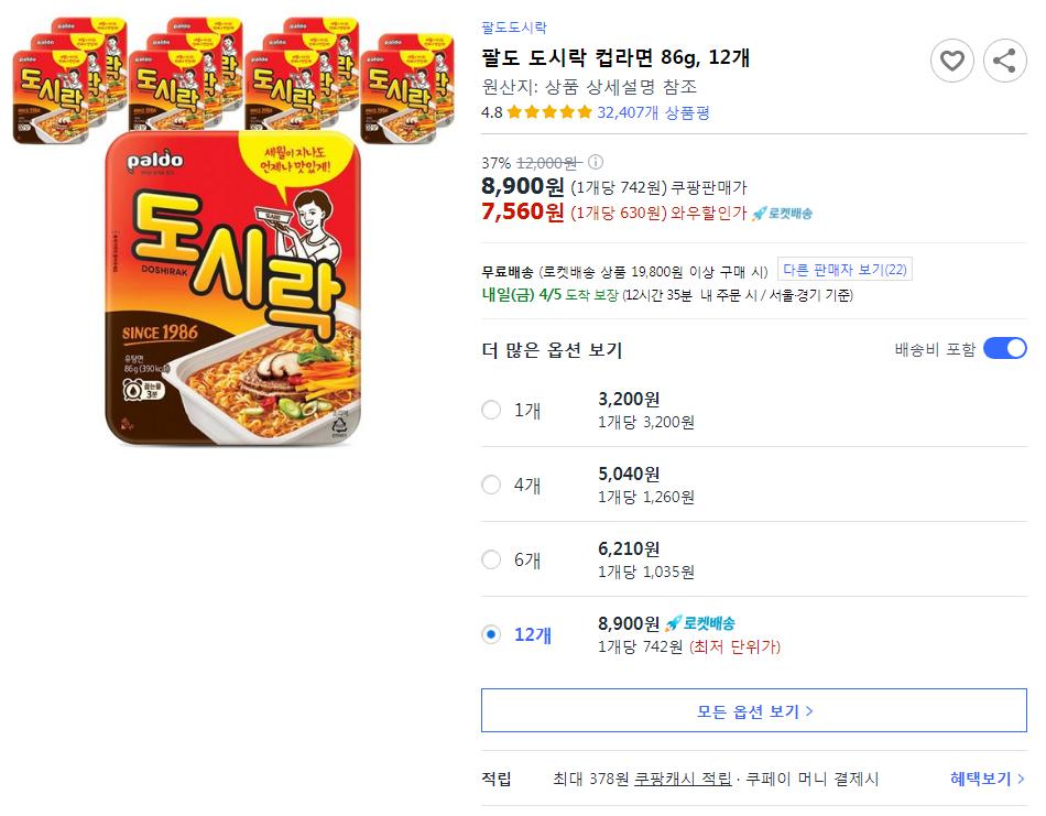 [쿠팡] 팔도 도시락 컵라면 86g, 12개 와우할인가