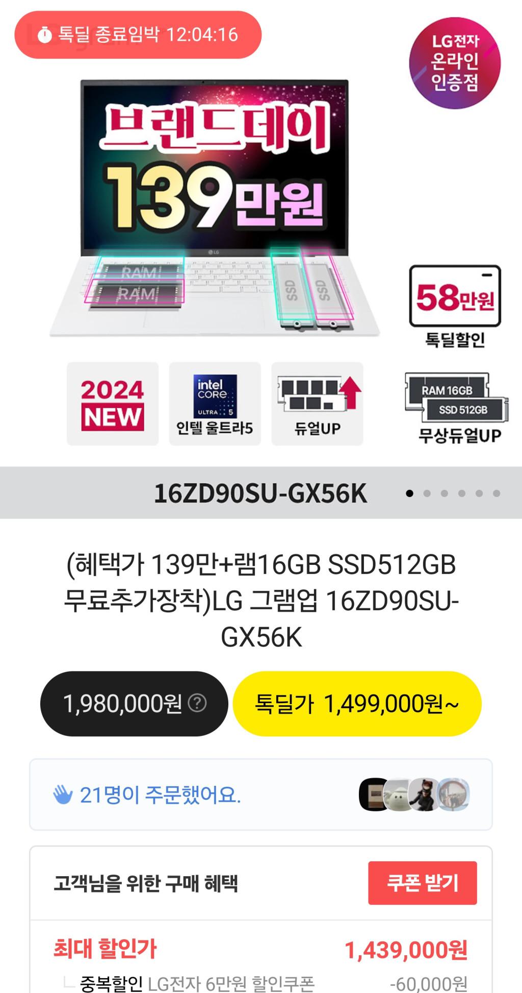 [카카오톡딜] LG그램 16ZD90SU-GX56K Ultra5 + 램업글 카카오페이 (무배)